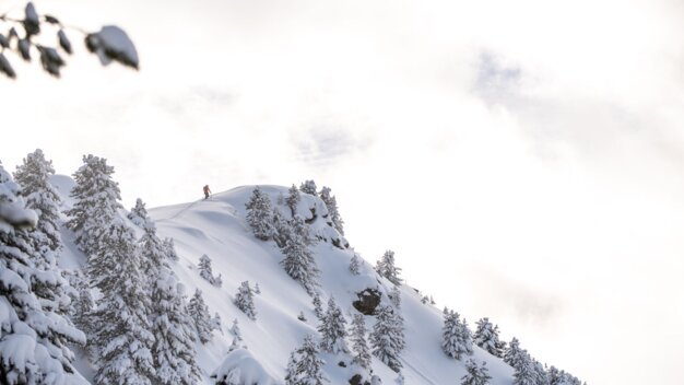 Verschneiter Berghang mit Person am Gipfel. | © Tim Marcour