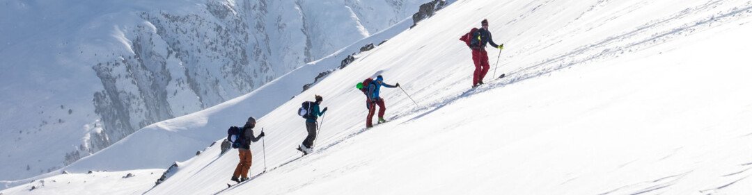 Eine Gruppe Skibergsteiger in verschneiter Berglandschaft. | © Tim Marcour