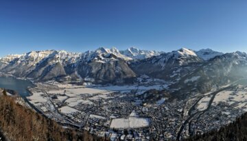 Panorama einer verschneiten Berglandschaft mit See und Stadt. | © © Interlaken Tourismus